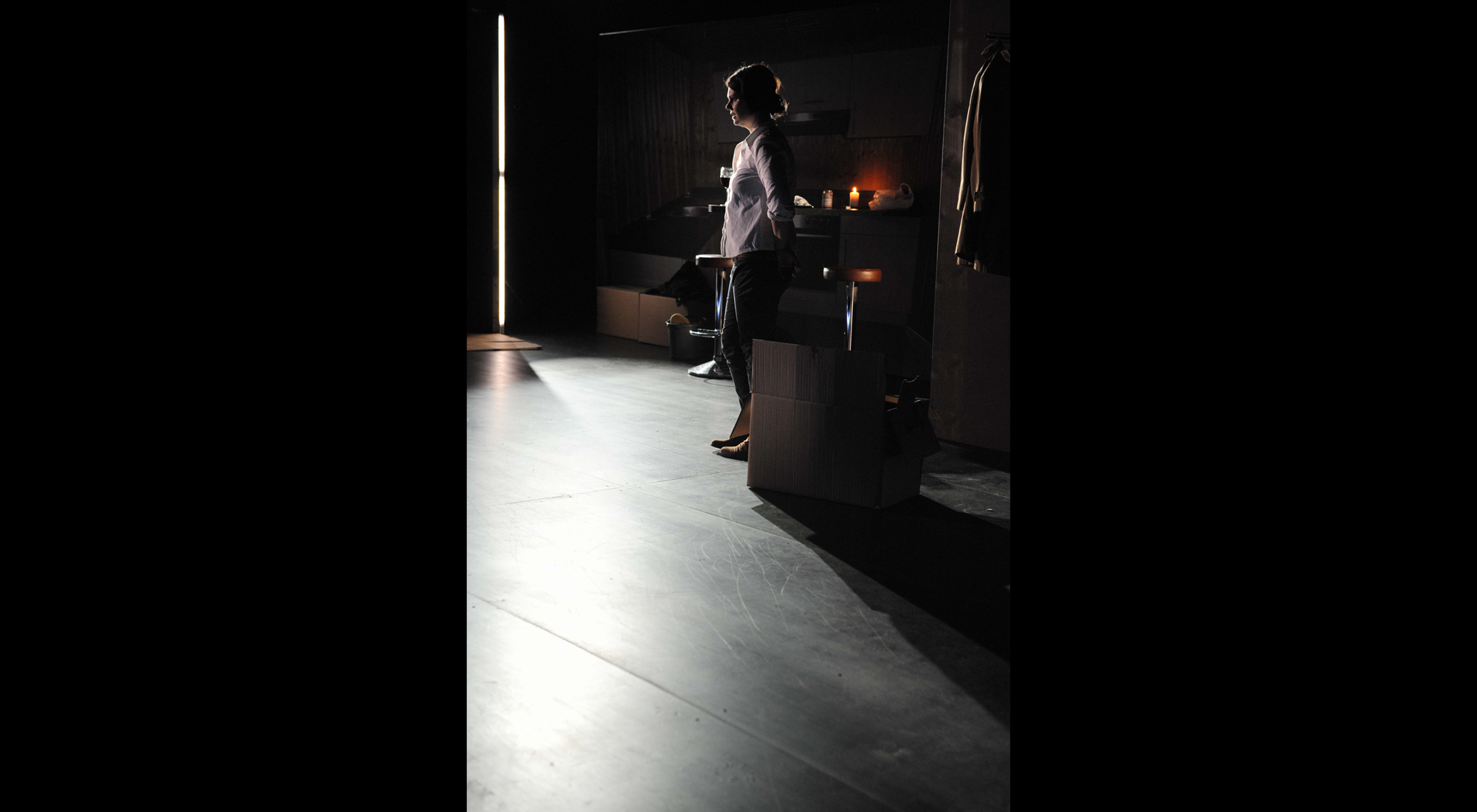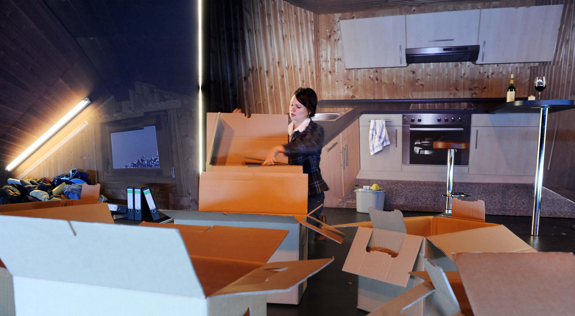 Michael Lippolds Bonner Inszenierung setzt einige Signale gegen den schlichten Realismus LaButes: Zwar zeigt die Bühne der kleinen Bonner Werkstatt die komplette Ausstattung einer Ferienhütte, aber nur als Fototapete (Ausstattung: Julia Ries). Zwar hört man getreu LaButes Regieanweisungen in den entscheidenden Momenten immer Donner und Regen, aber die Geräusche werden sichtbar auf der Bühne am Mikrofon erzeugt. Und auch die Radiomusik wird live gespielt: Der Gitarrist Gregor Schwellenbach liefert Improvisationen über U2-Themen und geistert zwischen den beiden Bühnenfiguren als für sie unsichtbares Gespenst herum. (Theater heute)