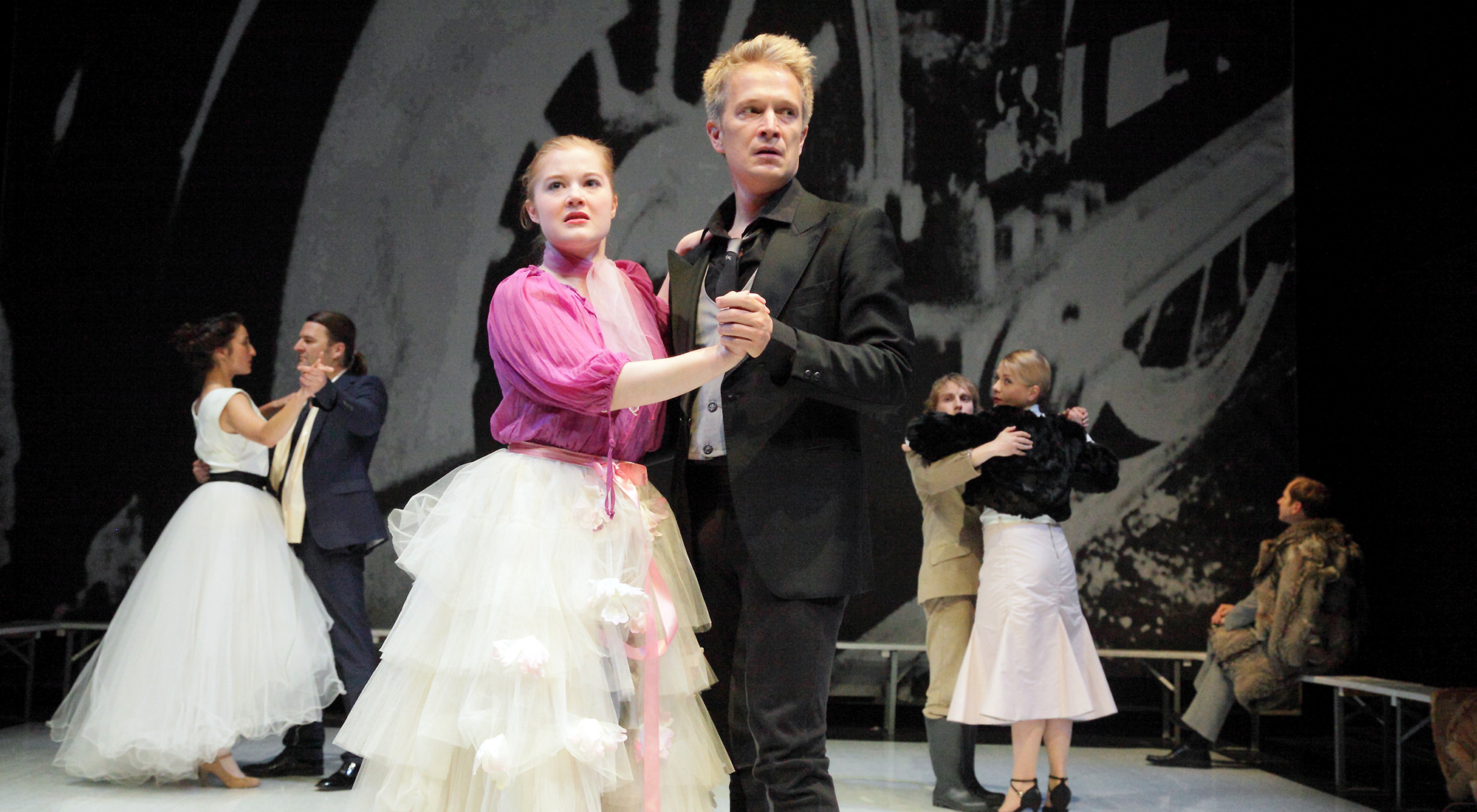 Wronski hat auf einem Ball mit Anna (Mandana Mansouri)angebändelt Eine Szene voll Kitsch und Ironie, beide tanzen, von Tüll umwogt, zu Sibelius‘ „Valse triste“. Die tragische Liebe gibt Wronski – sehr schön: Michael Lippold als Ewigjugendlicher mit Bindungsproblem – Gelegenheit, lässig mit Zigaretten und Wodkaflaschen zu hantieren. Anna wird noch mal jung. (Westfälischer Anzeiger)